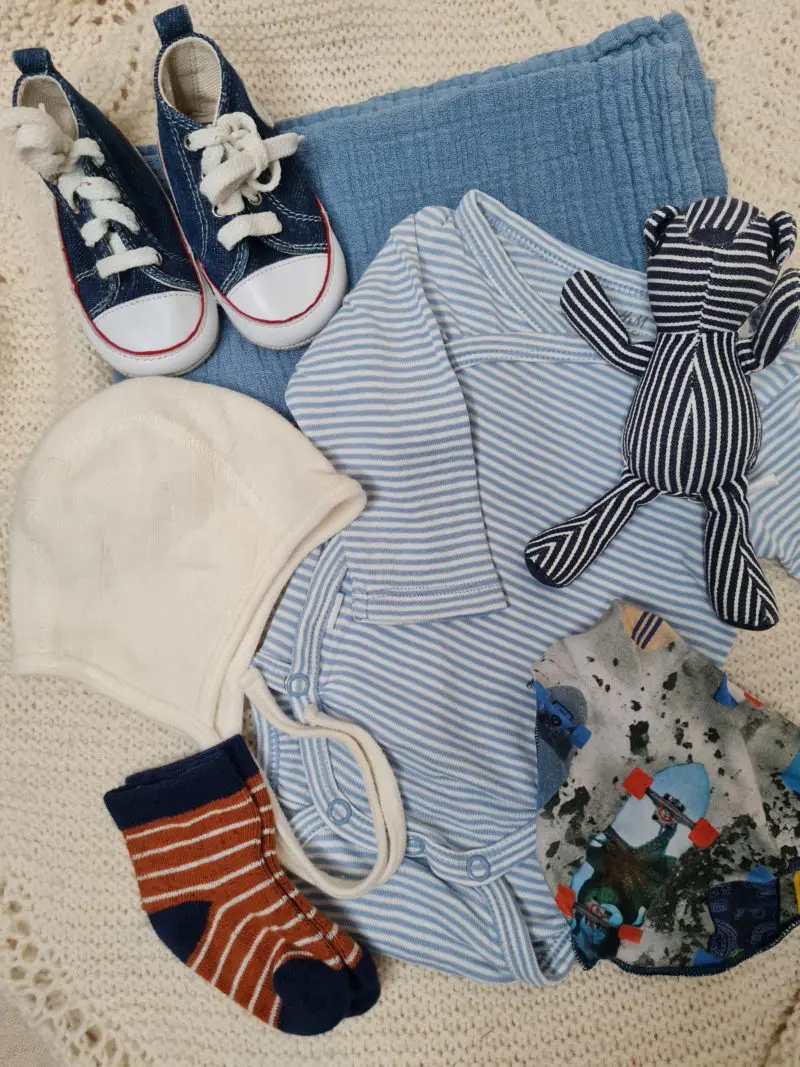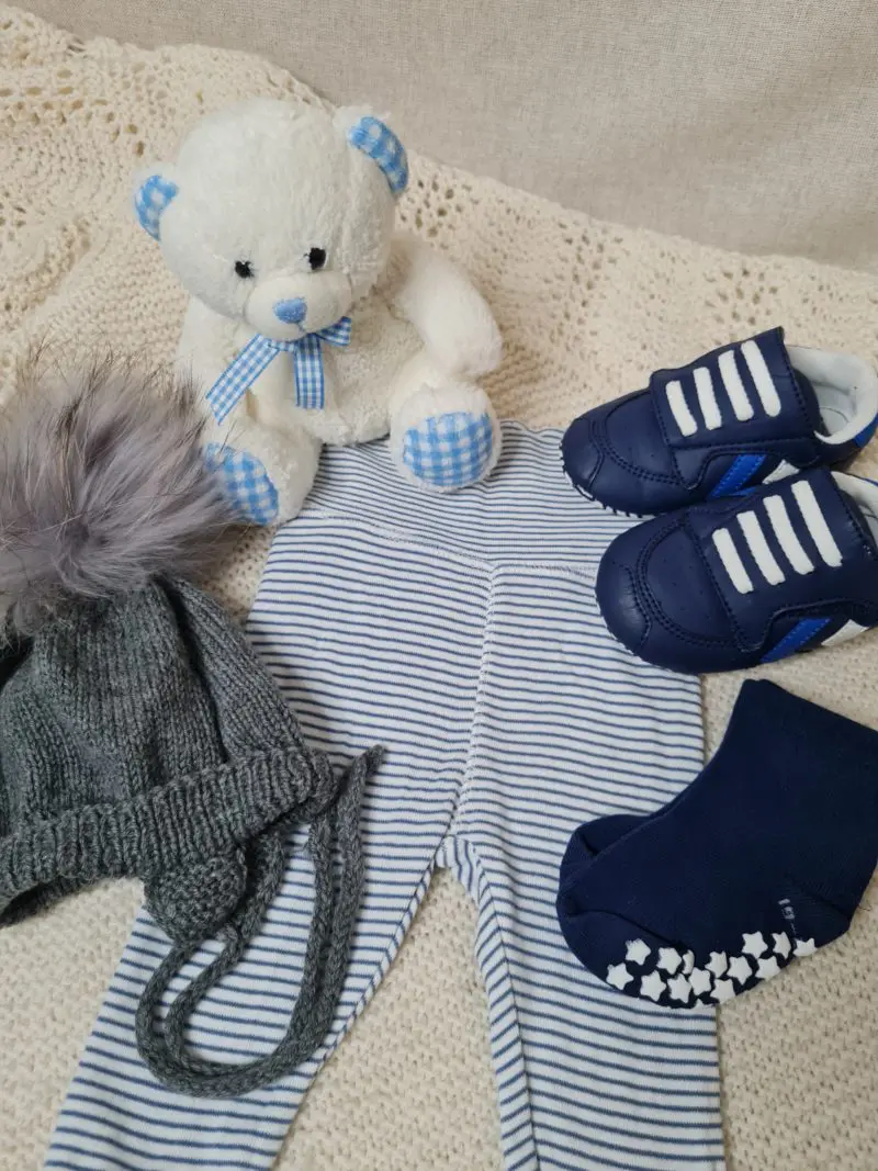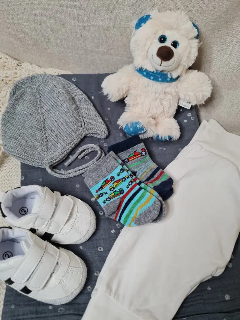 Fullbúinn gjafapakki. Vörur koma í gjafakassa. Pakkinn inniheldur: Buxur í stærð 50 frá H&M Sokkapar með gúmmí stjörnum undir yljum Heimaprjónuð húfa með dúsk, stærð 0-6 mánaða Skór frá Hummel í stærð 20 Mjúkur bangsi frá Keel Toys