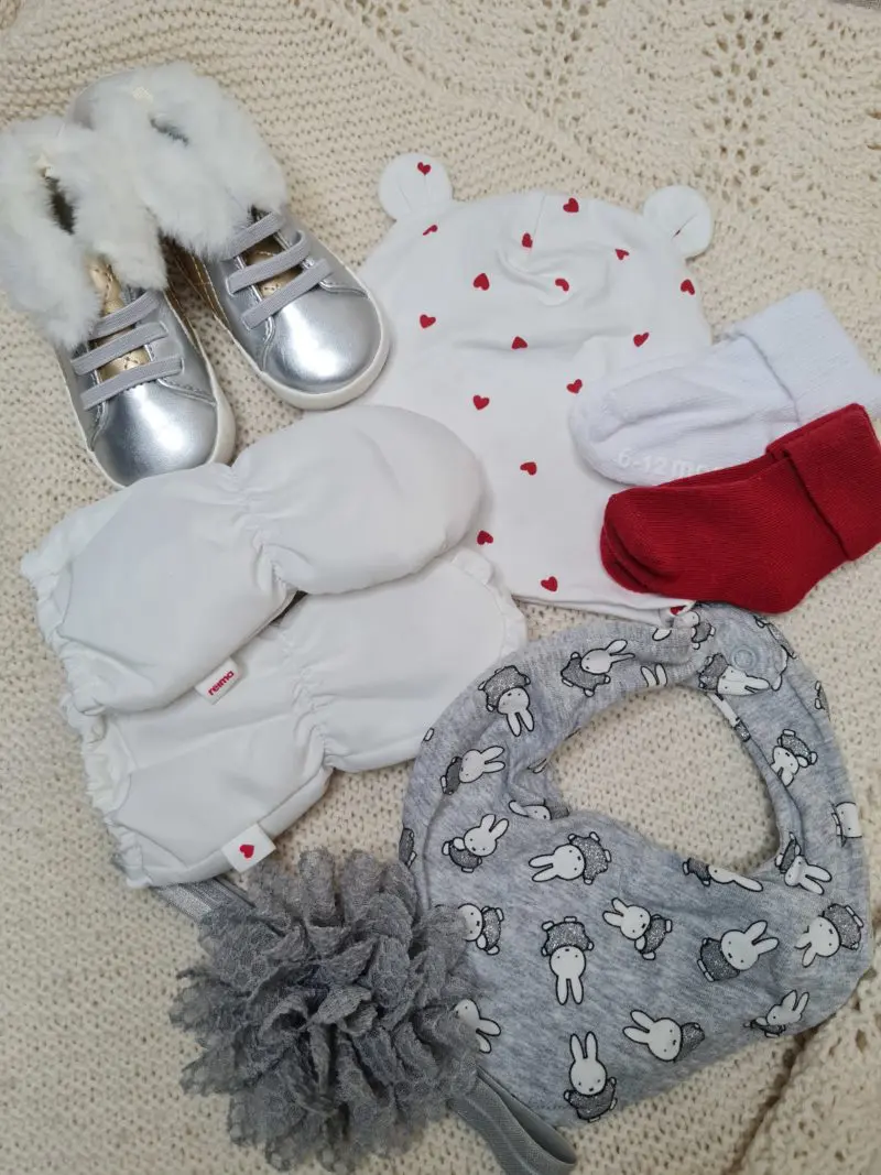 Fullbúinn gjafapakki Pakkinn inniheldur: Fóðraðir vettlingar frá Reima í stærð 0-1 árs Skór frá first impressions, crawling stage – ónotað með miðanum  Létt húfa frá Lindex í stærð 40/42 Tvenn sokkapör frá Cat & Jack Smekkur frá H&M Hárband/skraut