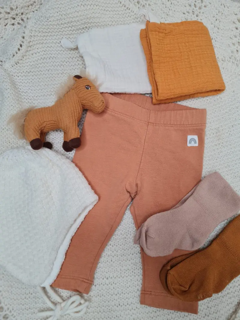 Fullbúinn gjafapakki Pakkinn inniheldur: Buxur st. 50 frá Lindex Fóðruð húfa frá Lindex í sttærð 38/40 Tvenn sokkapör frá Next baby Tvær mjúkar taubleyjur Tuskudýr – Hestur