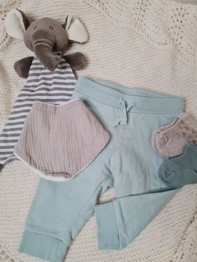 Fullbúinn gjafapakki Pakkinn inniheldur: Buxur frá H&M í stærð 62 Heimaprjónuð húfa sirka stærð 0-6 mánaða Skór í st. 3-6 mánaða Tvenn Sokkapör Mjúkur bangsi frá Windel GmbH & co Stór taubleyja/vafningur