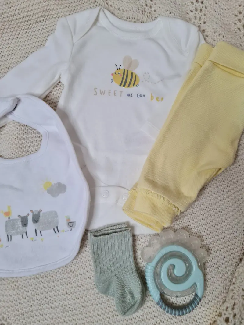 Fullbúinn gjafapakki. Vörur koma í gjafakassa. Pakkinn inniheldur: Buxur í stærð 3 mánaða frá Next baby (stærð 56/62) Sokkapar frá Lindex Samfella frá Primark í stærð 0-1 mánaða (stærð 50/56) Smekkur frá Jainco Nagdót frá difrax