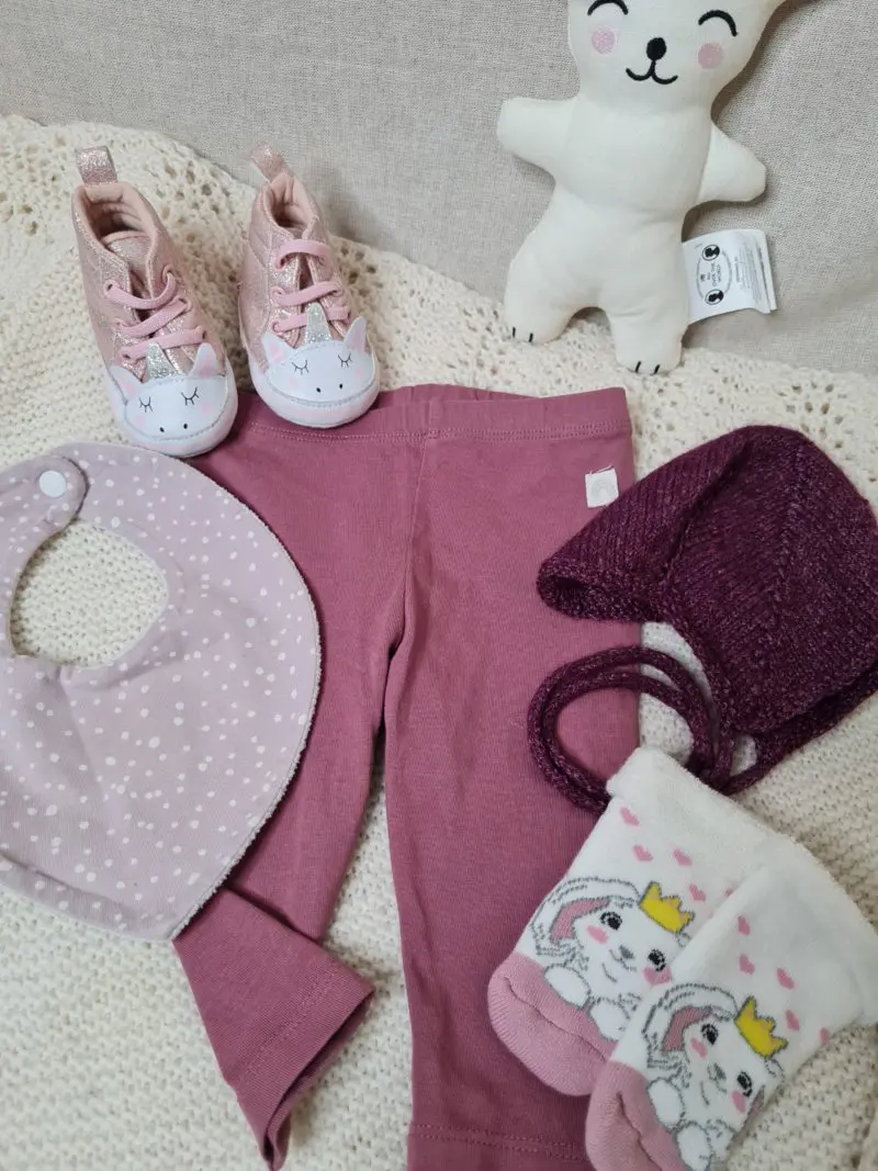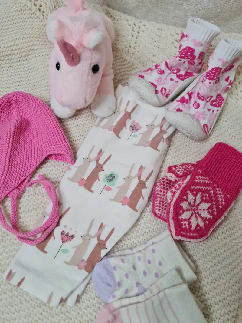 Fullbúinn gjafapakki Pakkinn inniheldur: Buxur frá Next í stærð 0-3 mánaða Heimaprjónuð húfa sirka stærð 0-1 mánaða Heimaprjónaðir vettlingar með þumlum 0-12 mánaða Sokkaskór í st. 20 Tvenn Sokkapör Mjúkur bangsi – Einhyrningur