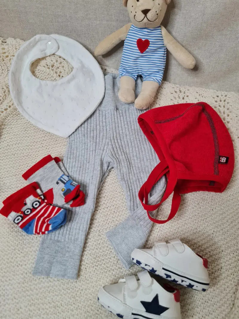 Fullbúinn gjafapakki Pakkinn inniheldur: Skór 3-6 mánaða Húfa heimaprjónuð Buxur Lindex – stærð 62 Sokkapar Smekkur – heimasaumaður Mjúkt leikfang
